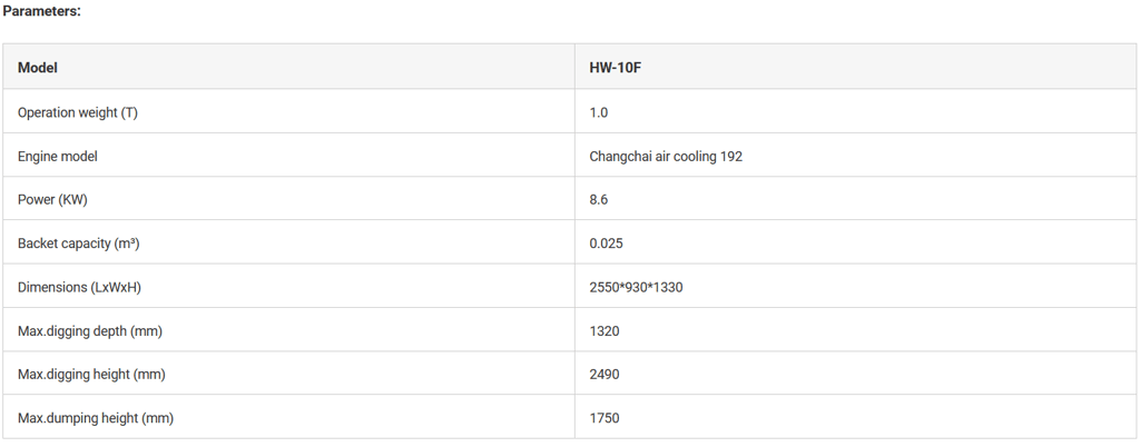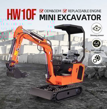 The HW-10F Crawler Excavator is an excellent choice for all your excavation needs. This reliable and durable excavator is available directly from factory, delivered directly to your site, providing customers with peace of mind and a one-year warranty for excavator engine. With an operation weight of 1 Ton, it is easy to maneuver and transport, making it ideal for various construction and landscaping tasks. The bucket capacity of 0.025m³ is perfect for small to medium-sized excavation projects. The HW-10F Crawler Excavator boasts a rated power of 8.6 kw, ensuring efficient and reliable performance. Our excavators provide power and performance in a compact size to help you work in the most compact applications. Invest in the HW-10F Crawler Excavator today and experience its exceptional capabilities.