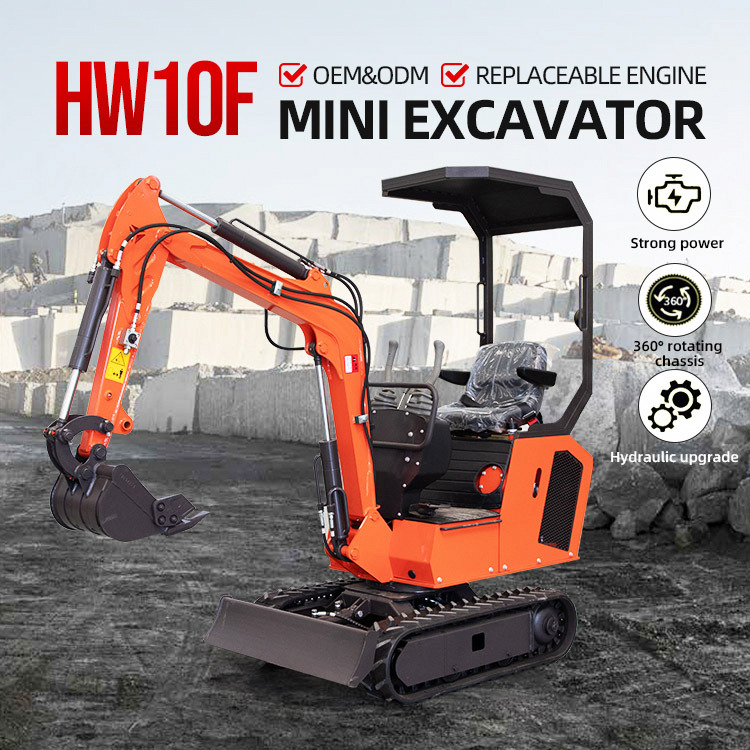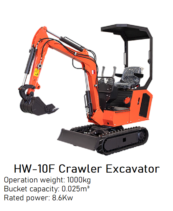 HW-10F Crawler Excavator is suitable for loose soil in vegetable greenhouses, landscaping, orchard nursery planting and digging, concrete pavement crushing, sand and gravel mixing, and construction operations in small spaces.