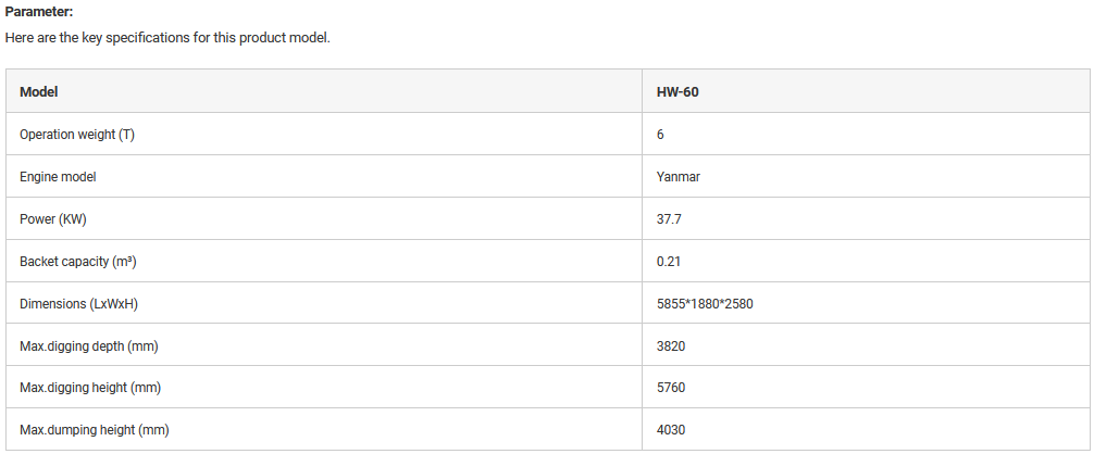 In terms of dimensions, the HW-60 measures 5855mm in length, 1880mm in width, and 2580mm in height, making it compact and maneuverable in various job sites. It offers a maximum digging depth of 3820mm, a maximum digging height of 5760mm, and a maximum dumping height of 4030mm. These specifications enable efficient excavation and material handling, ensuring optimal performance in tight spaces.