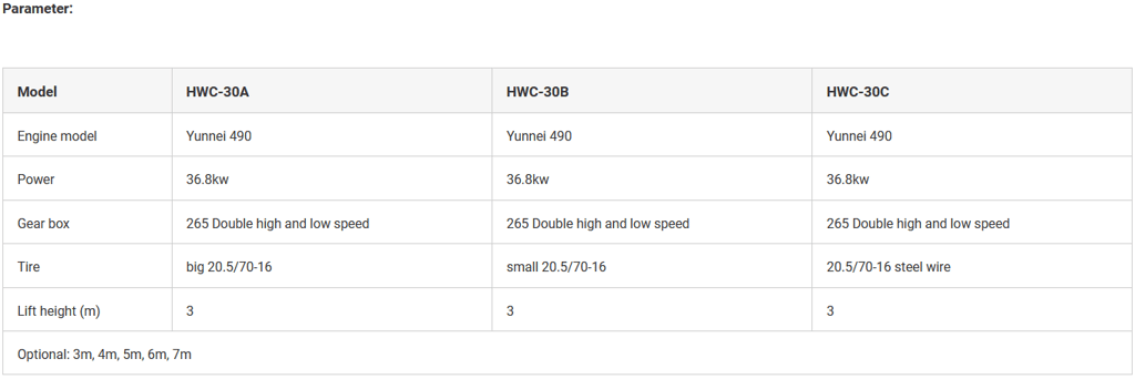 Dependability and Adaptability: The HWC-30 is designed to withstand rugged environments and perform reliably in challenging conditions. It is built with durable components and robust construction to handle demanding tasks. Whether it's rough terrain, uneven surfaces, or adverse weather conditions, this forklift is engineered to adapt and excel in diverse settings.