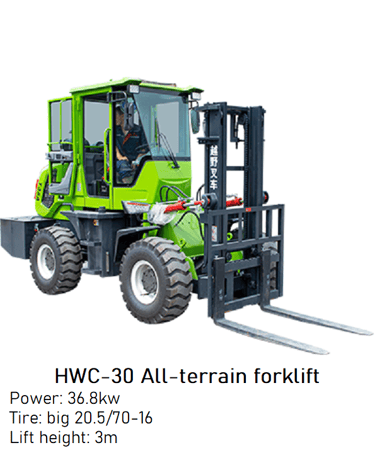 Overall, the HWC-30 All-terrain forklift is a reliable and adaptable solution for demanding environments. Its exceptional maneuverability and emphasis on efficiency make it a valuable asset in industries that require versatile and robust material handling equipment.